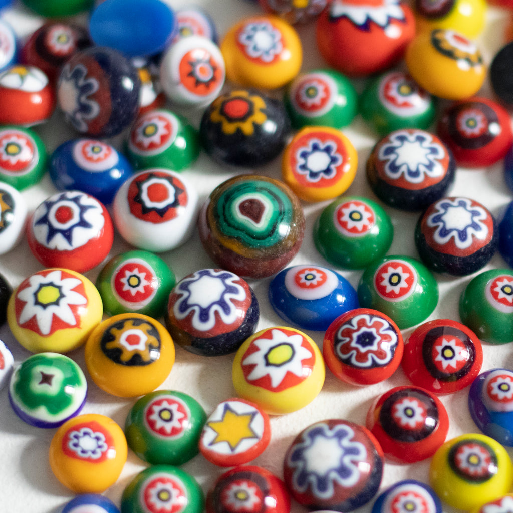 Millefiori literally means a thousand flowers. The beads are made from long canes of glass which are grouped and fused together, then sliced crosswise to create a colorful floral pattern. These mosaic beads can be found throughout history to ancient times!